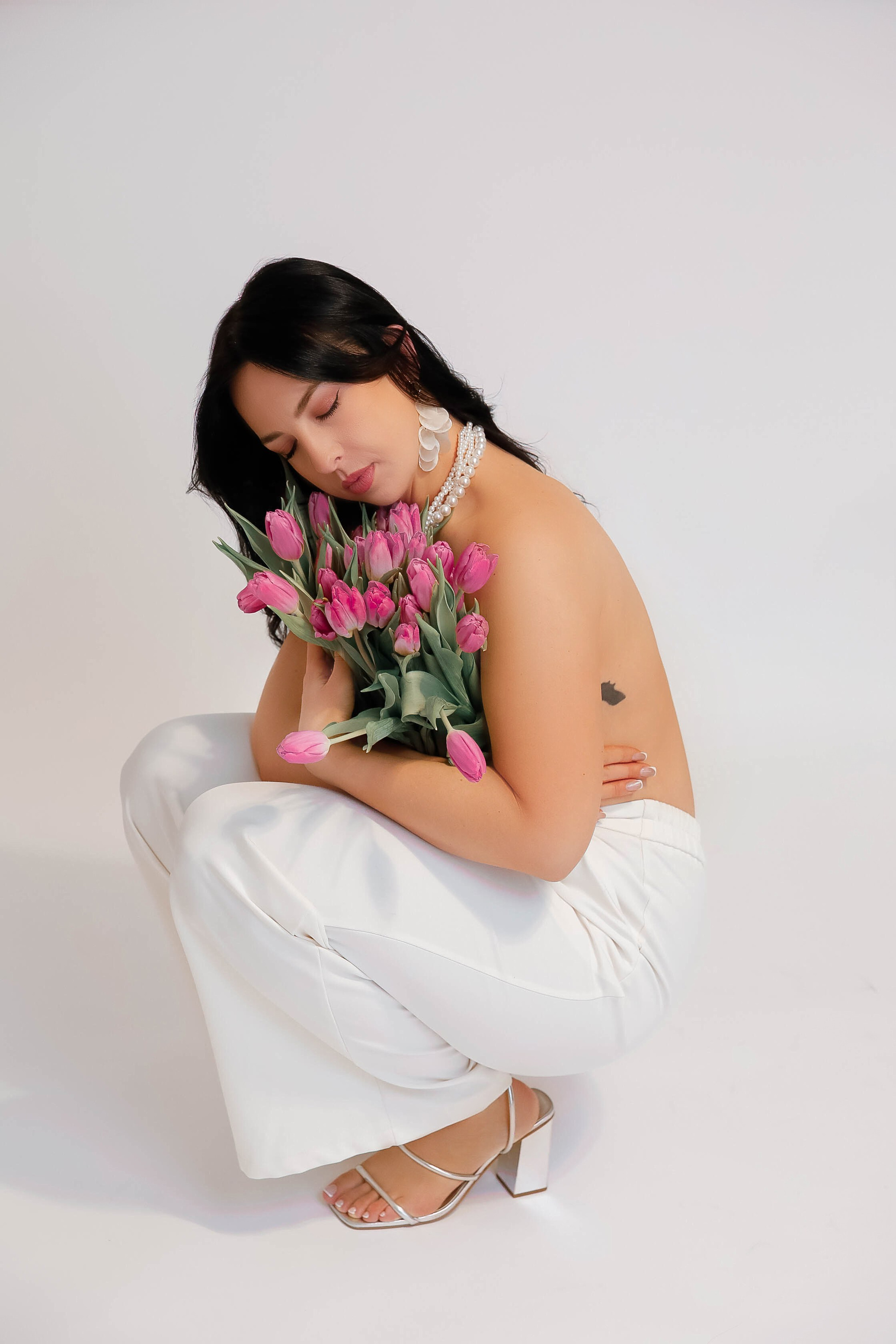 - Hair: Elegant waves, an updo, or soft curls can complement the outfit and make her feel polished and elegant. If the photoshoot is more playful, loose and natural hair could work just as well.